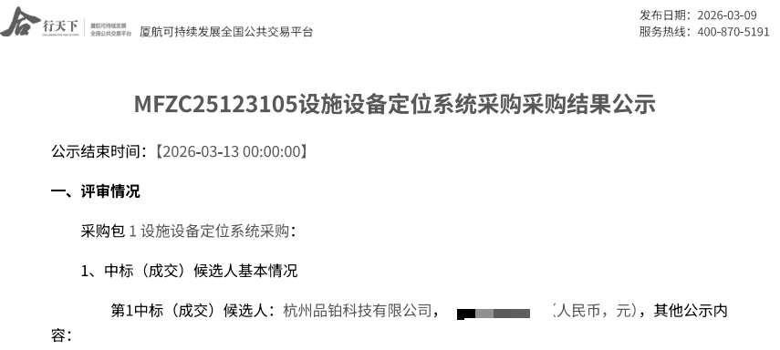 来源:admin发布日期2026-04-24 14:58浏览:近日,品铂科技成功中标厦门航空设施设备定位系统采购项目。这标志着品铂科技在航空维修与地面保障领域的数字化解决方案,再次获得了行业头部客户的高度认可。本次合作,我们将助力厦航实现从“看不见”到“全掌控”的管理飞跃。